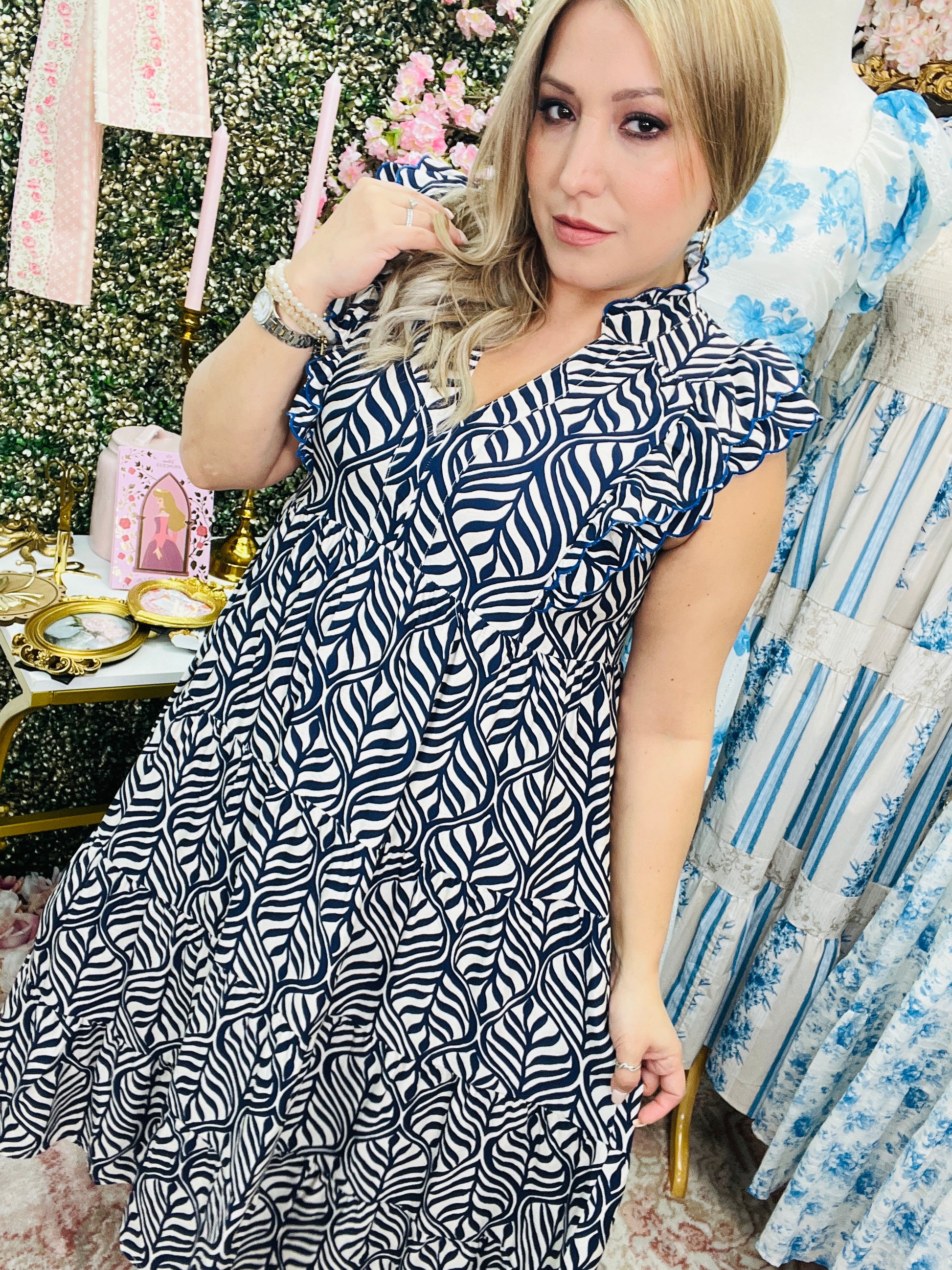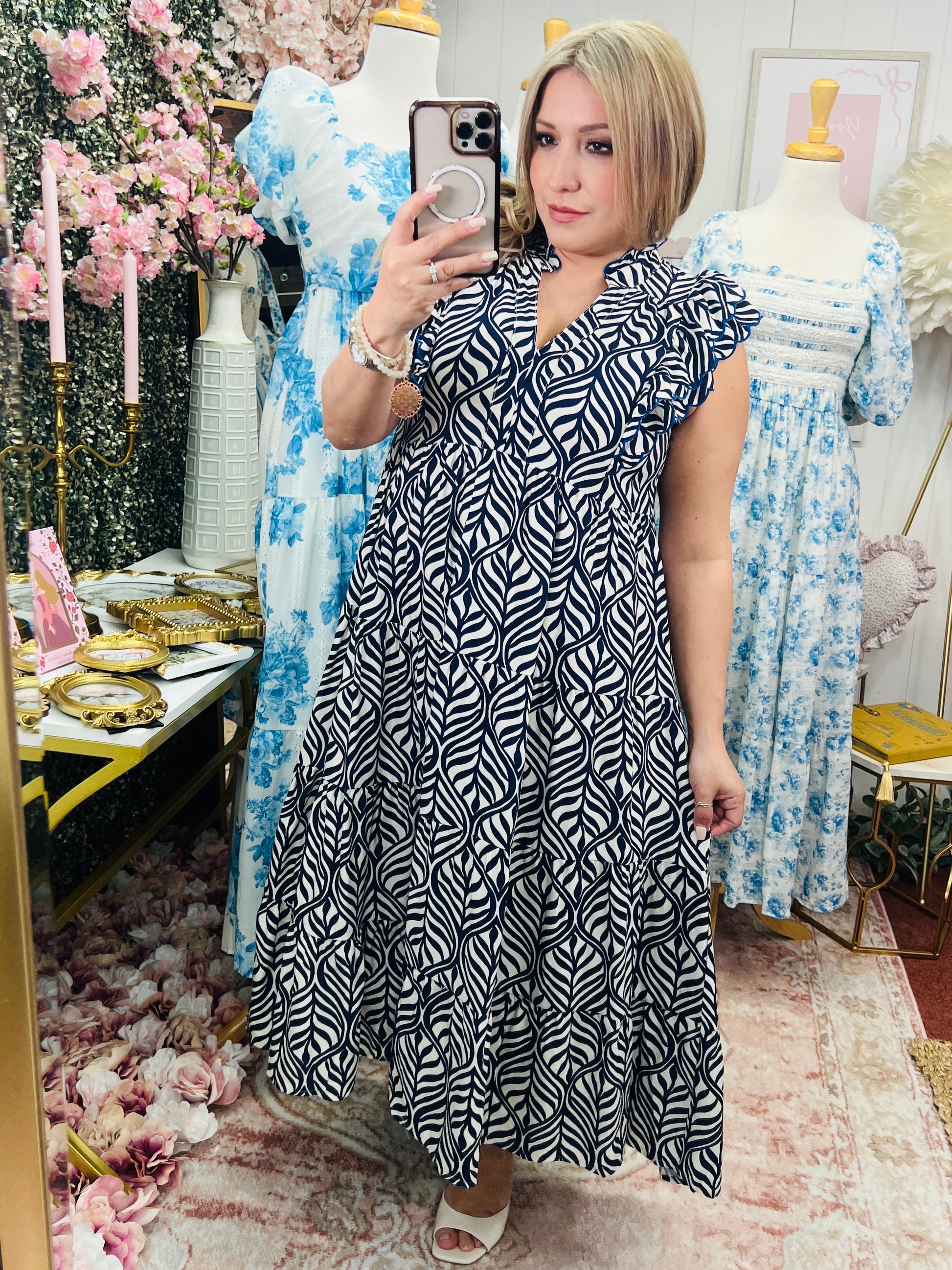 Embrace effortless charm with this leaf-inspired abstract print midi dress. The tiered babydoll silhouette creates a playful, flattering shape, while delicate flutter sleeves and a V-neckline trimmed with ruffles add romantic flair. Perfect for casual outings or dressed-up occasions, this unlined piece offers breathable comfort and a breezy feel that captures the essence of carefree style.