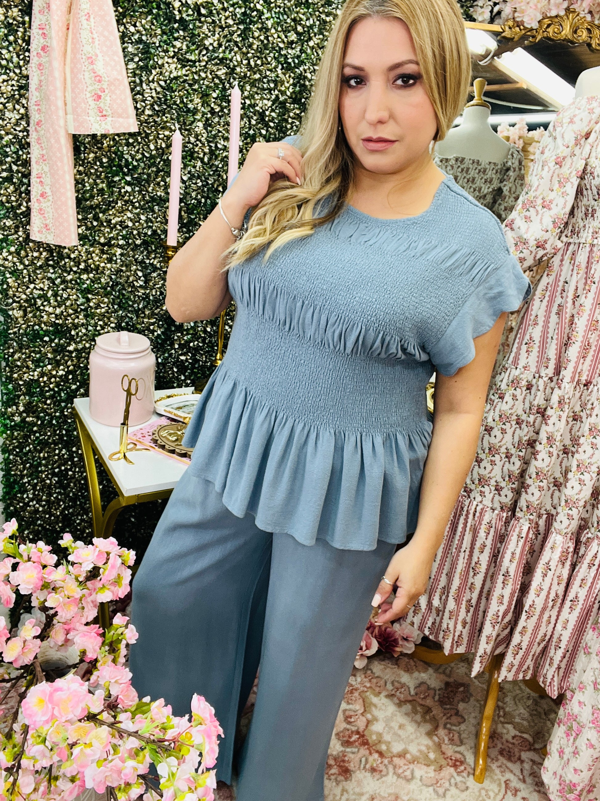 LINEN BLEND PEPLUM TOP/LINEN SCALLOP HEM WIDE LEG PANTS SET* STEEL BLUE